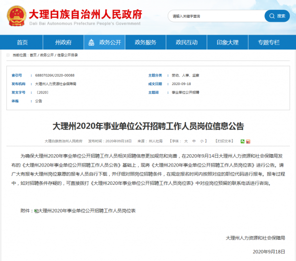 2020年云南省事业单位统考 大理州公告岗位表已发布